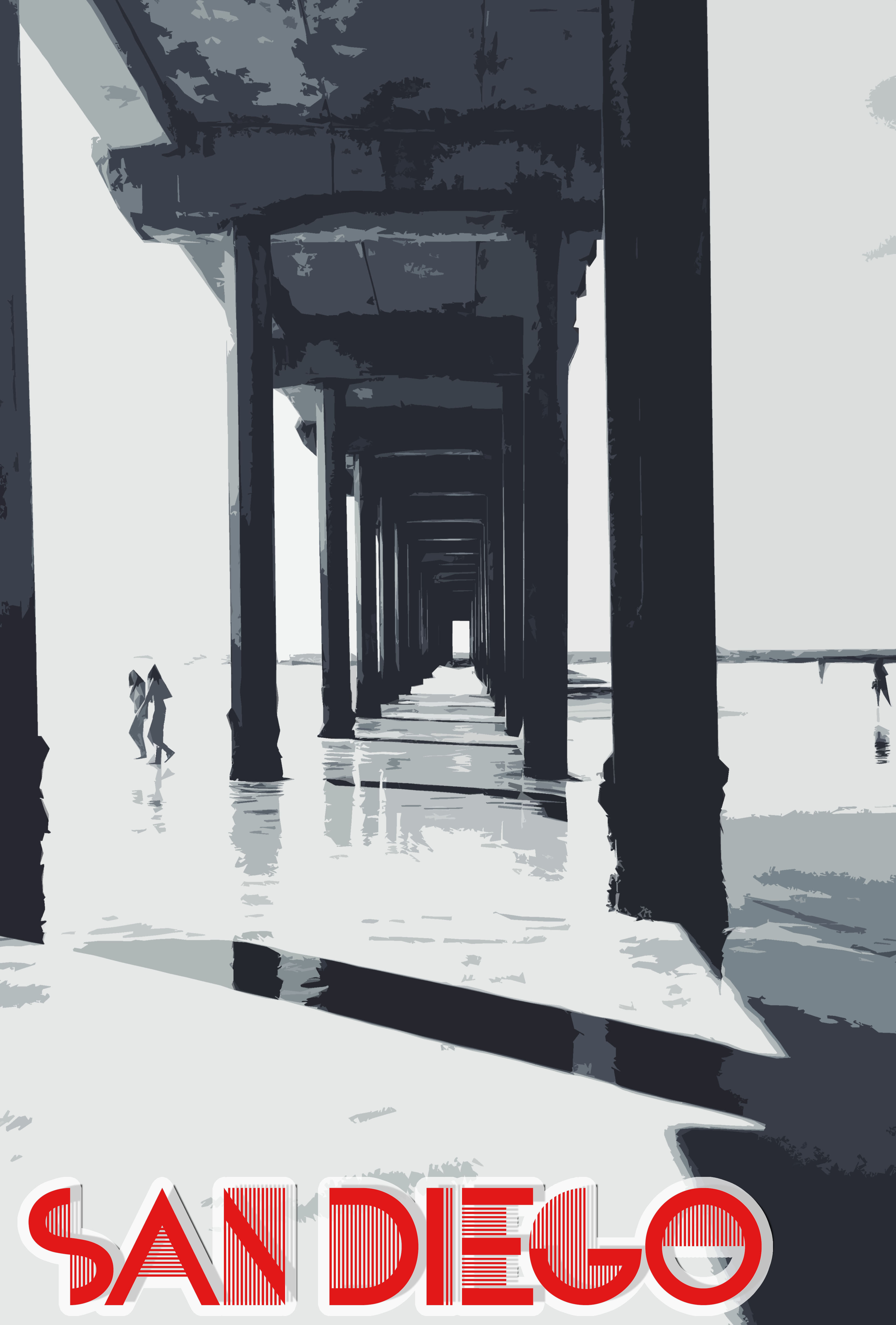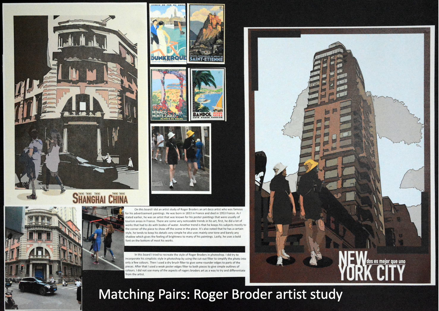 The basis is simple. Using a great photograph or two from vacation, make a poster in the style of Art Deco. I recommend studying Roger Broders for this project. The photos can be reduced to something simple like Art Deco using a few Photoshop functions: the cutout filter, poster edges filter, and the image saturation (to enhance the color). Students should also download an Art Deco font (free online).