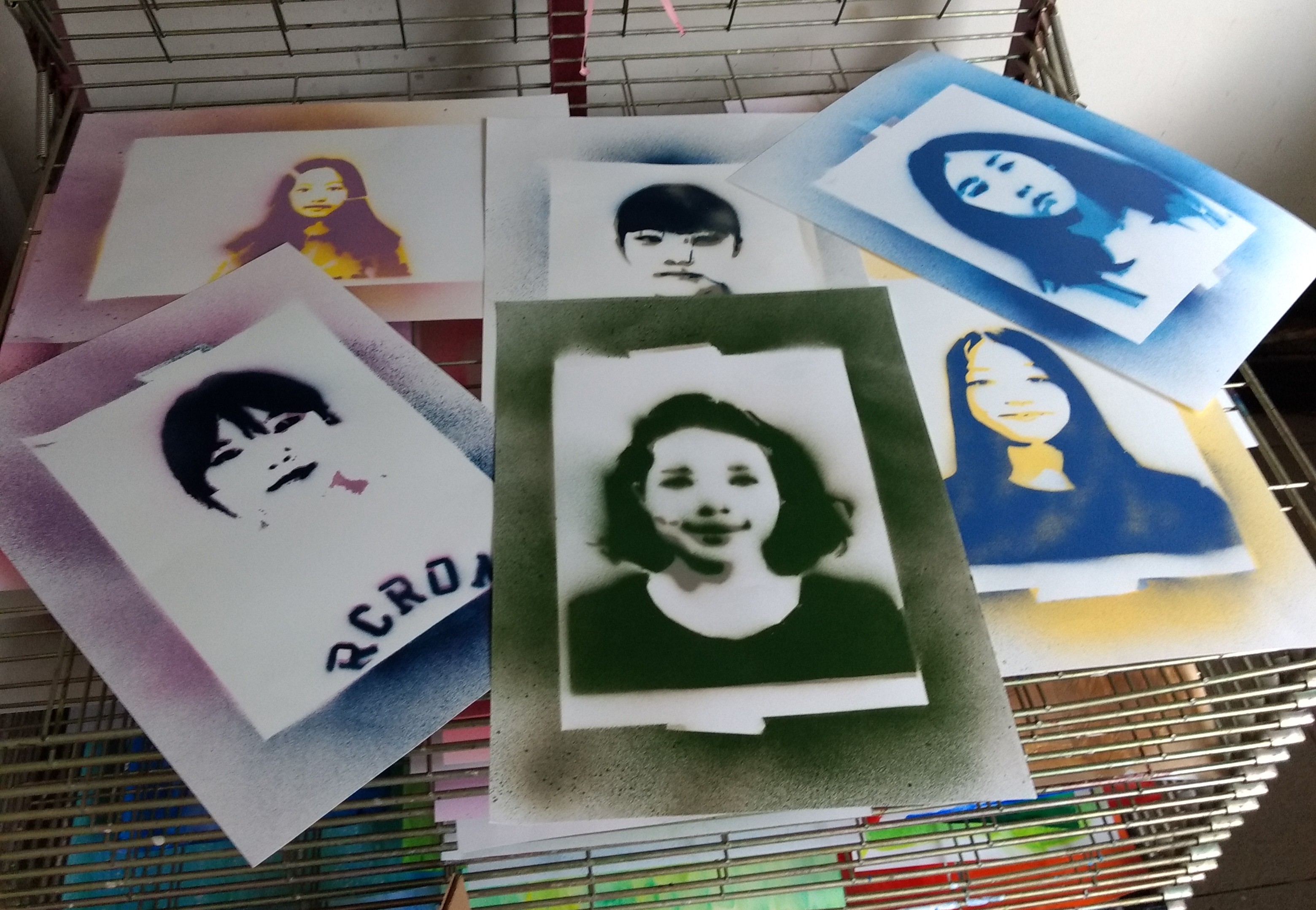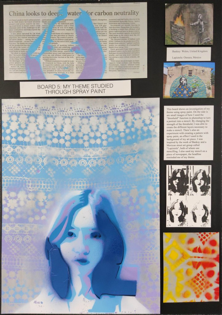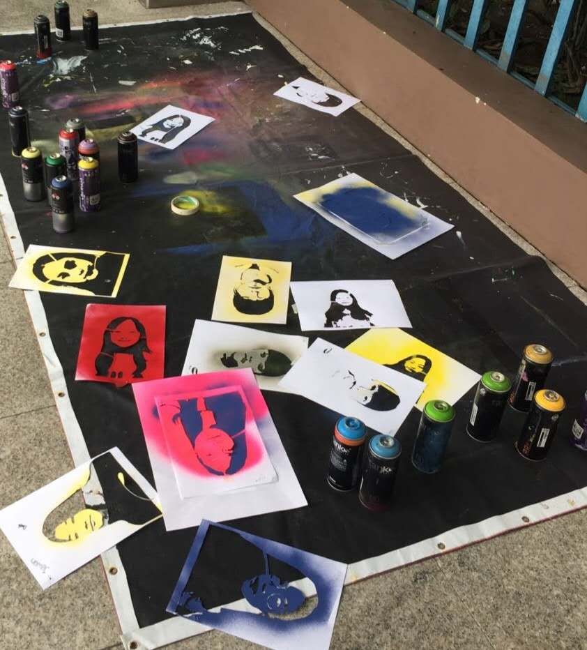 This is another art unit that uses Photoshop to create some powerful images. In Photoshop, the function to make a stencil is called “threshold” and can be used to make various layers. I like 3-4 layer stencils personally. Any more than that and I get some major burnout from my students getting tired of cutting shapes with exacto knives. There are also numerous websites that will make stencils for free, but learning how to do it with Photoshop will ultimately give you more control. The main thing to know when stencilling are “bridges and islands”. The stencil has to be connected somehow, so no “islands” or little pieces that aren’t connected to the outer stencil. If you do have an island, you must connect it with a bridge. We print our stencils on 60-90lb paper (card stock). You also need to punch a hole in the the corners of all the stencil layers together so they line up after you cut them out and spray them later. Protip: Montana Spray Paint sells a water-based spray paint that is practically odorless and much less harmful (though still wear a mask when spraying!).