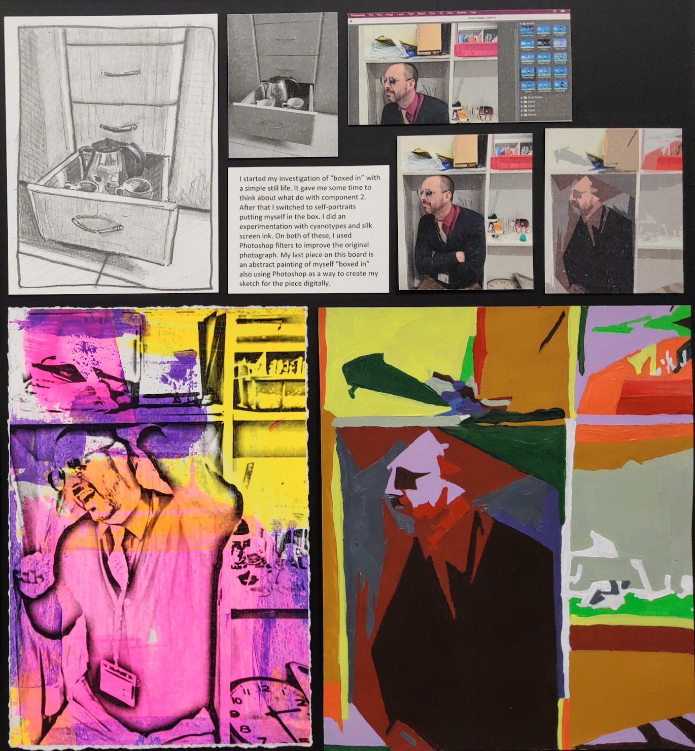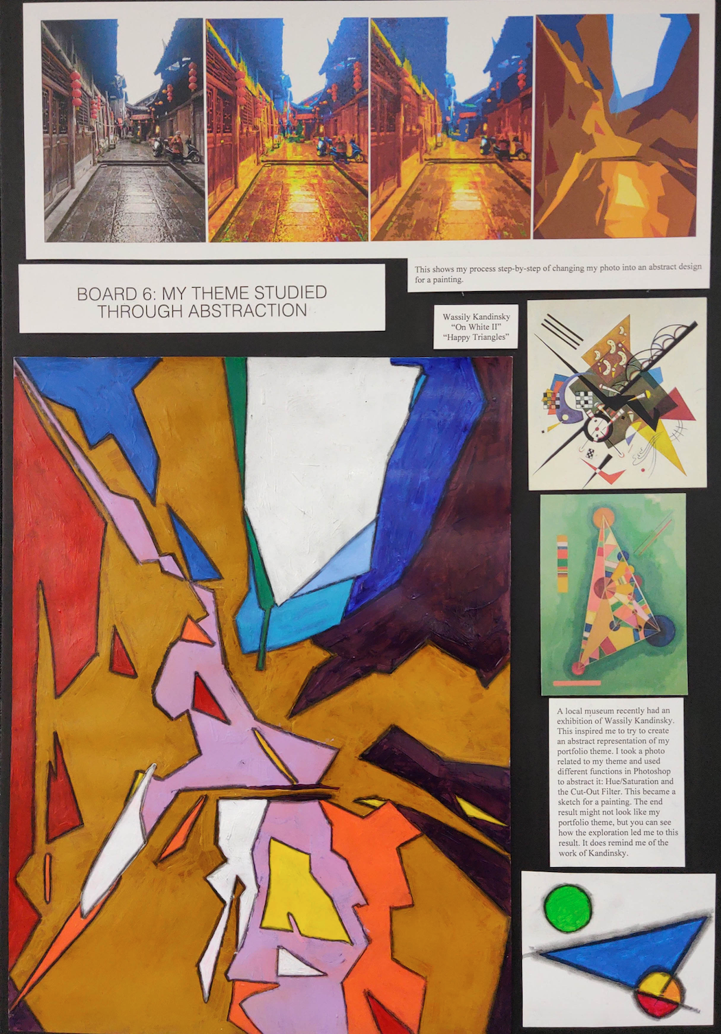 The great things about this is it offers lots for students to show about the creative process. Which is a key component of the criteria in IB Process Portfolios or IGCSE Portfolio Boards. Below are two examples from IGCSE portfolio boards (ignore the unrelated artwork). I recommend pairing this with an artist investigation of Wassily Kandinsky. Below that is a student example of a photo from 7Eleven turned into a very beautiful and complicated abstract image.
