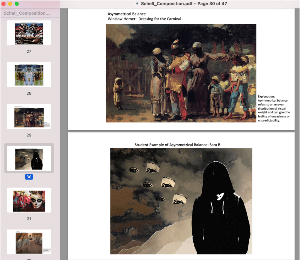 Artistic composition is a fundamental part of my pedagogy. Perhaps that’s because it was looked over for most my own art education and I had to painstakingly pick it up through intuition and osmosis. Admittedly, that’s what you want though…an informed but intuitive approach to art making. Anyway, I teach my kids about composition and give them a laundry list of rules (or considerations) to memorize. Is it too geeky or nit-noid though? I don’t think so. Even if you don’t make compositionally strong work afterwards, at least you should have a better vocabulary for unpackaging the artwork you see in galleries or museums.