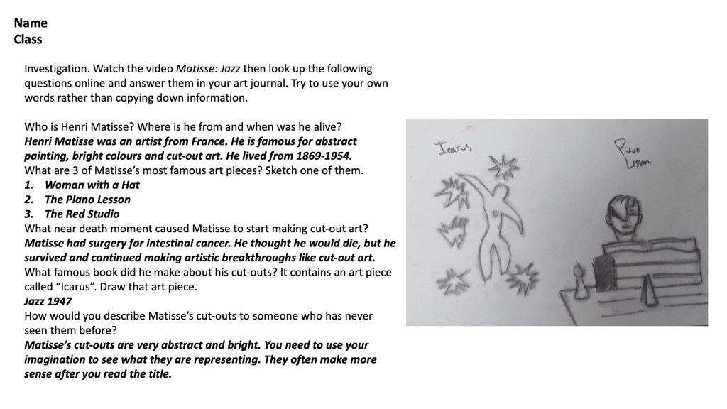 There is a great video or two by the BBC on Matisse starring art critic Alastair Sooke (I’m a huge fan and think his videos are a great resource for children ages 13 and up). I show my students a brilliant section on Matisse’s book Jazz that’s a segment from Sooke’s program “Matisse: A Cut Above the Rest” (minutes 5:24-9:00).
