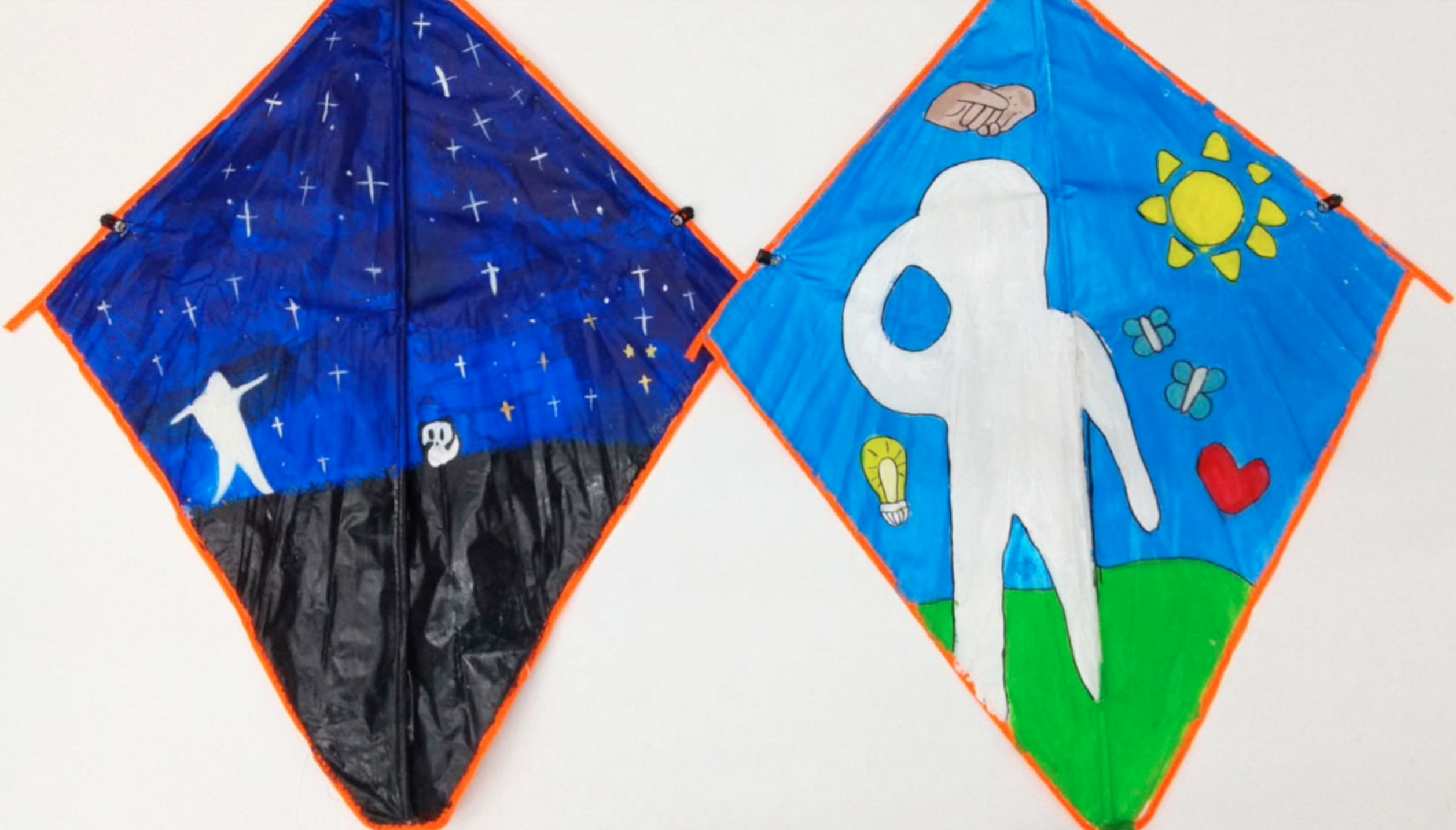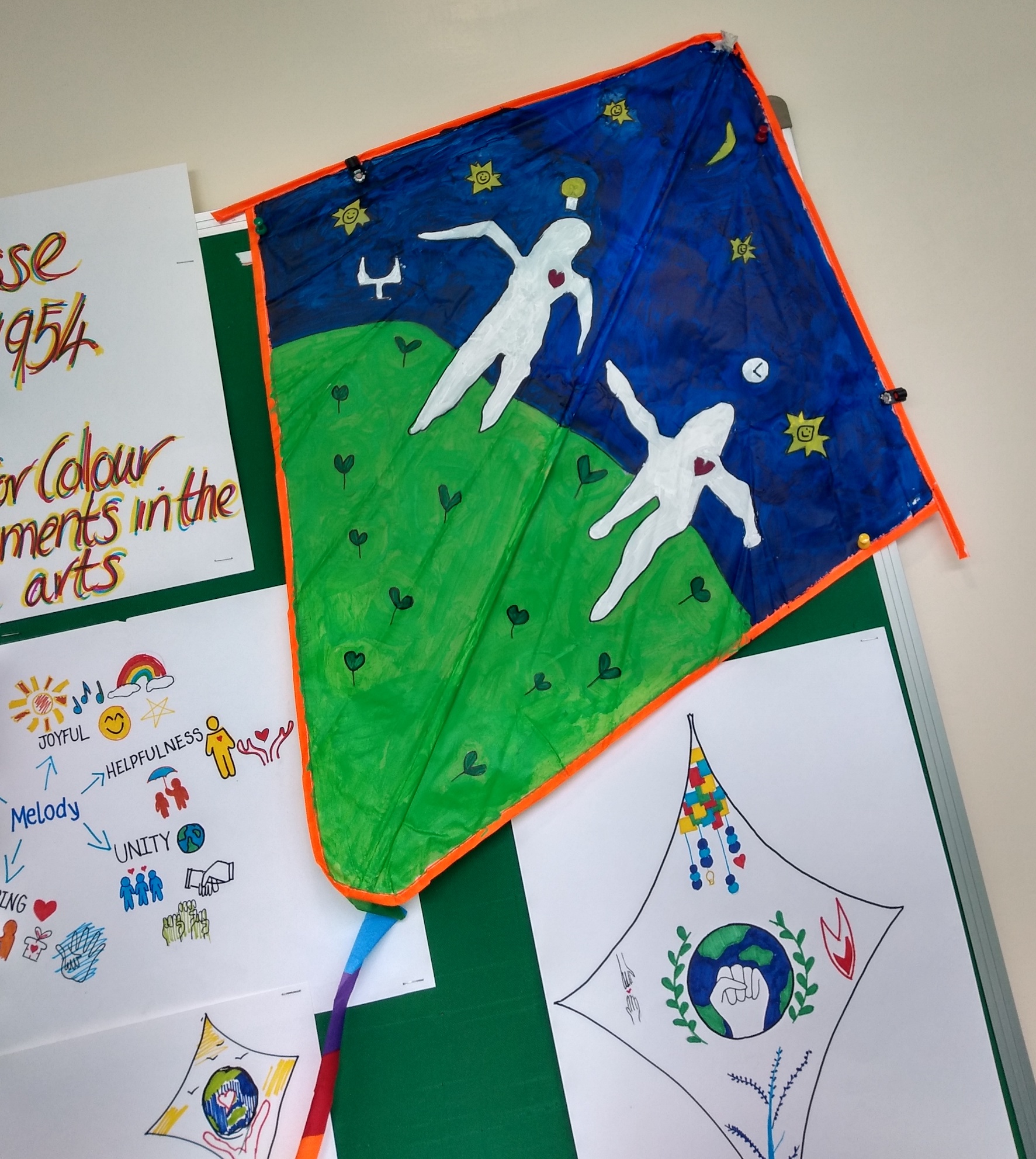 These kites were painted by year 7 students. It was a study of Henri Matisse and looking for ways to express school virtues through symbolism.