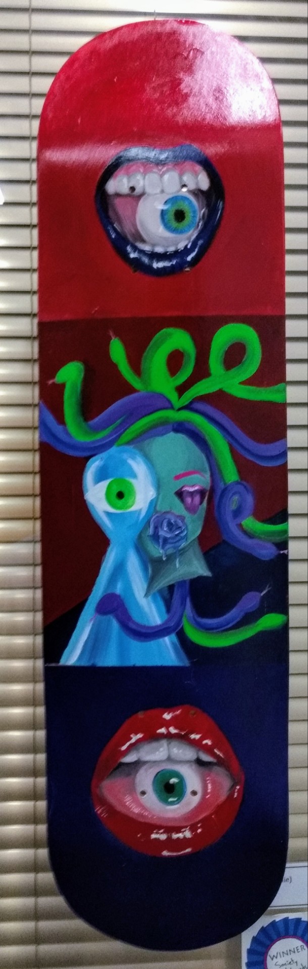One common theme in my art projects is the idea that artists recreate, over and over again, objects we all know and love. Arguably, this is more effective than making paintings, as it turns an idea on its head. When you stand in front of a painting, you’re expecting to see a painting. Obviously, it has to be done well. But if a student has recreated a skateboard, playing card, covid mask, soap dispenser, or scroll, it involves an element of surprise and surprise often comes with the emotion of joy. Once you go down this path, you often start seeing objects as art pieces all over the place. It’s a legitimate paradigm shift. There’s also an aspect of problem solving in this, which is essential to great art lessons. Art classes should teach students to be great problem solvers, after all. Below are some examples.