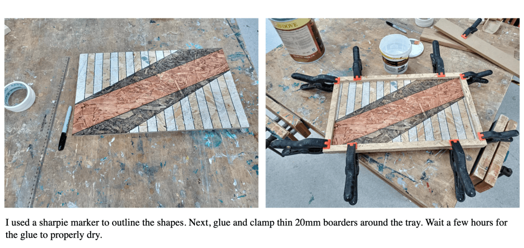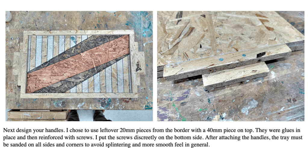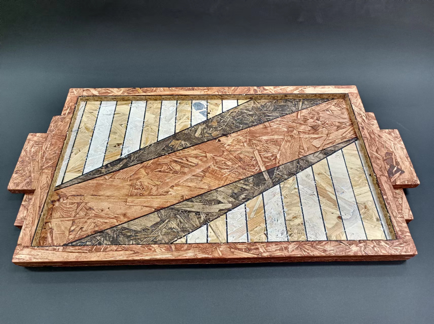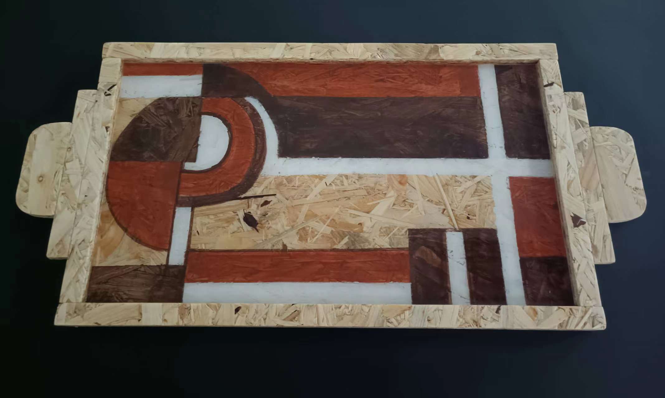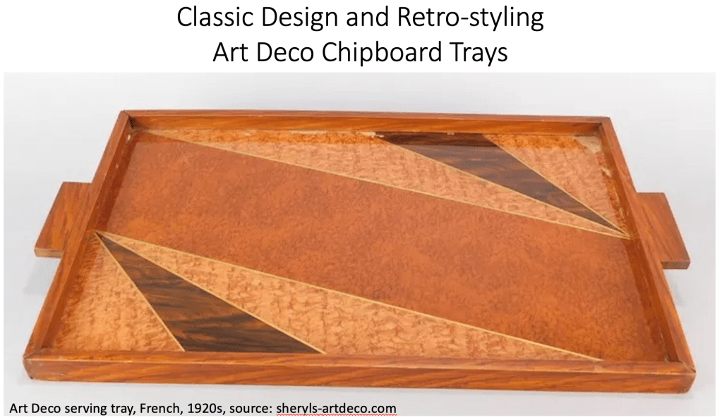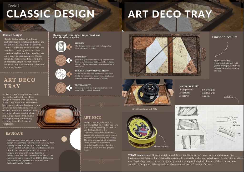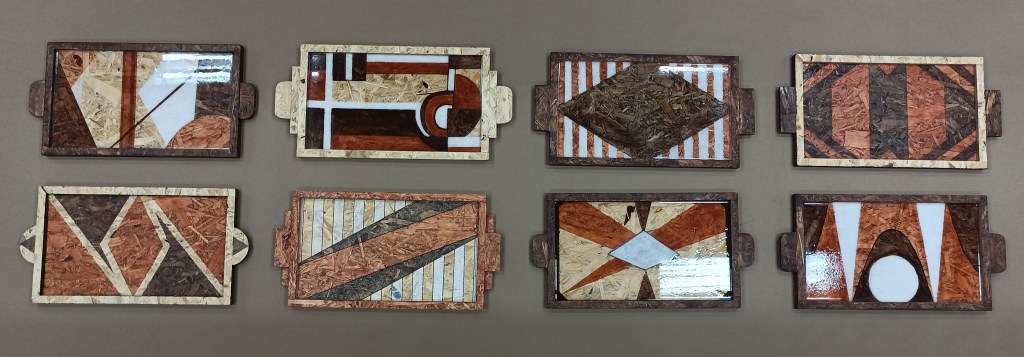 I saw these Art Deco wooden trays made in 1920s France and took them as inspiration for the project. We used chipboard to create a unique texture and added Danish oil, and citrus finishing wax after construction to make the objects: all natural, all biodegradable. I experimented with resin on one of my trays to give the piece more water resistance and didn’t like the results. It also added a lot of extra weight to the tray. I left the option open to my students to finish the board with resin if they wanted. I wanted to students to go full eco-design, but many chose resin. I suppose it doesn’t matter much, as I don’t think these pieces will end up in a landfill because they’ll be cherished by the owner, and that’s the point of classic design.