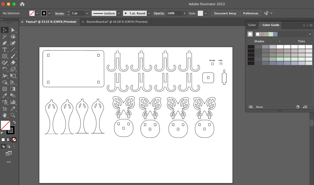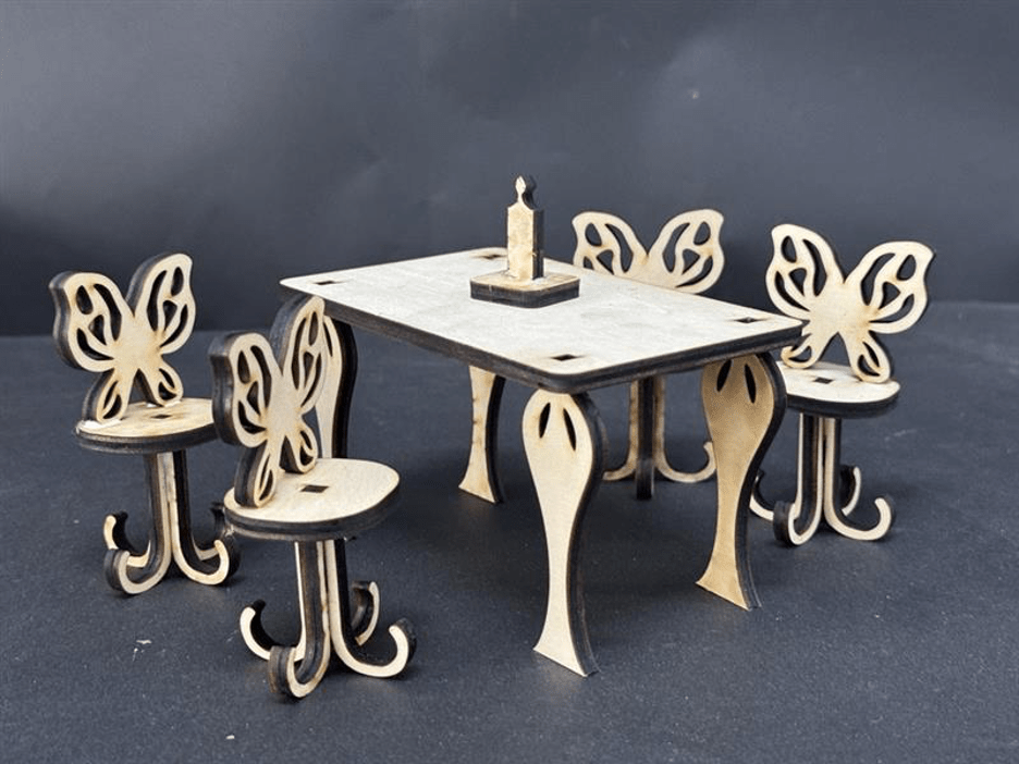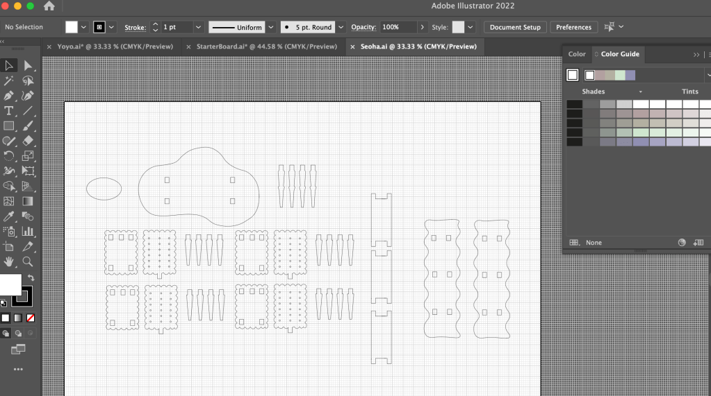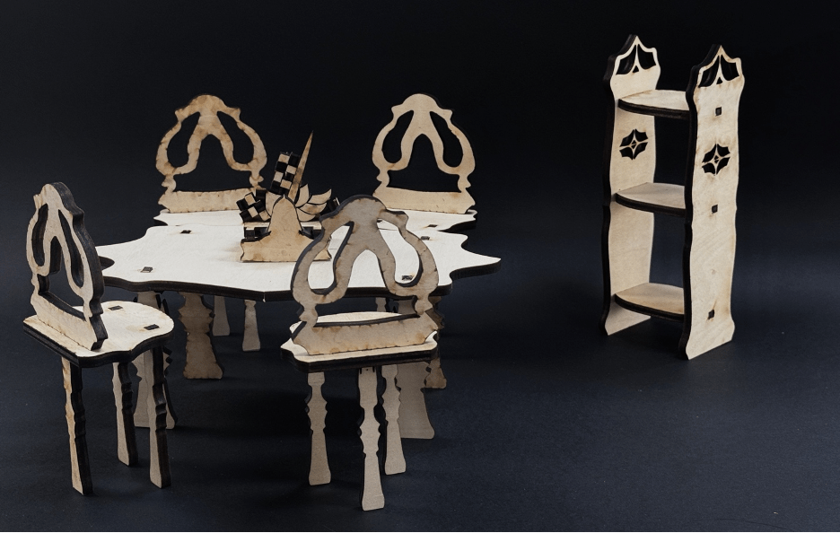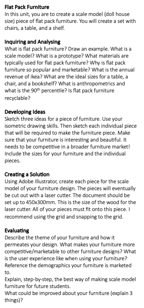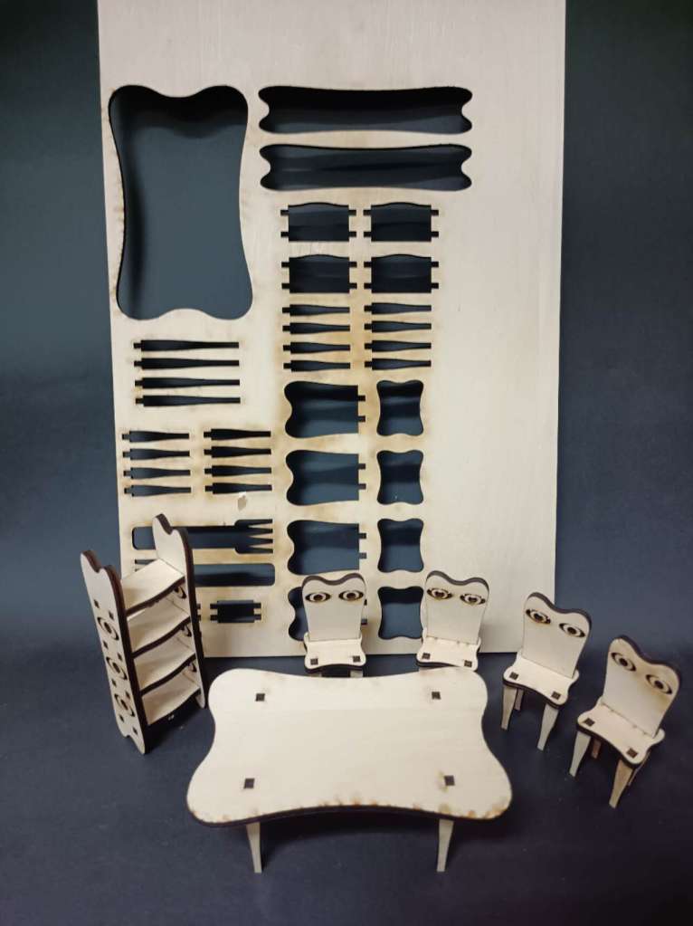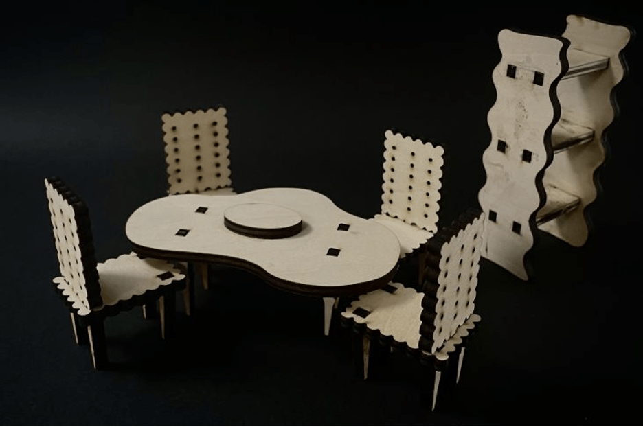 Students studied the numerous benefits of flat-pack furniture, including its marketability, sustainable focus, and user-centered (anthropometric) design. Using Adobe Illustrator and a laser cutter, they created tiny scale models of a table set and shelf. Then assembled them, tested their functionality, and took a photograph. We cut the furniture out of 452x304x5mm plywood. I created an illustrator document that size with the male and female pieces as a starting point for each student. It helped to make sure that the holes and connectors fit correctly probably saved us from wasting a ton of wood with trial and error. Students reinforced the joints with glue. I’d like to include fitting it neatly into a box next time I teach it.
