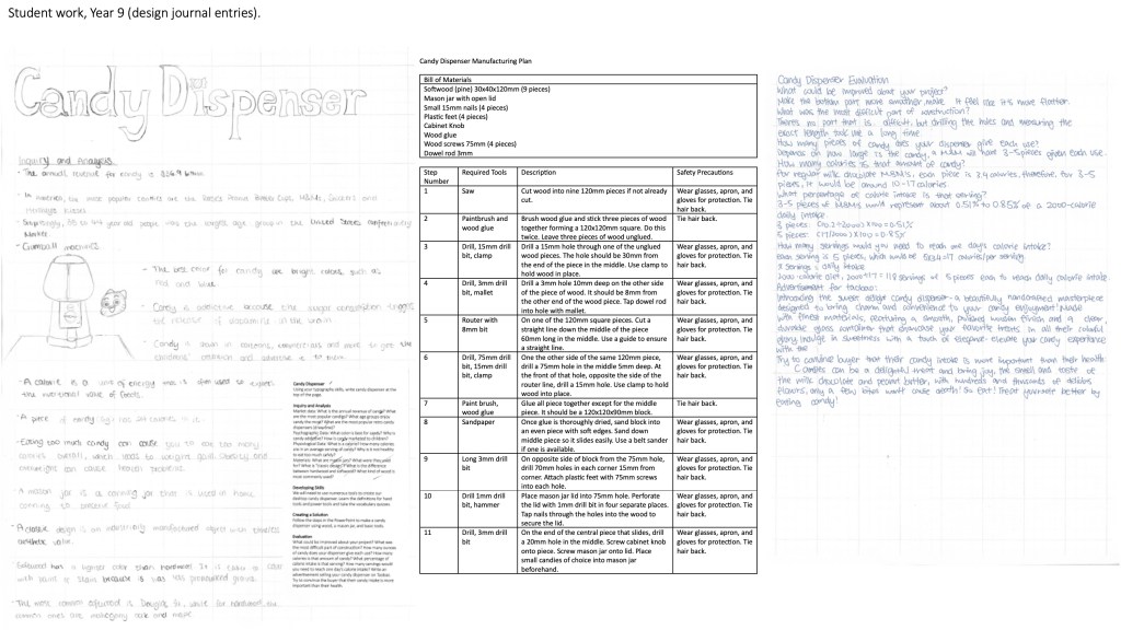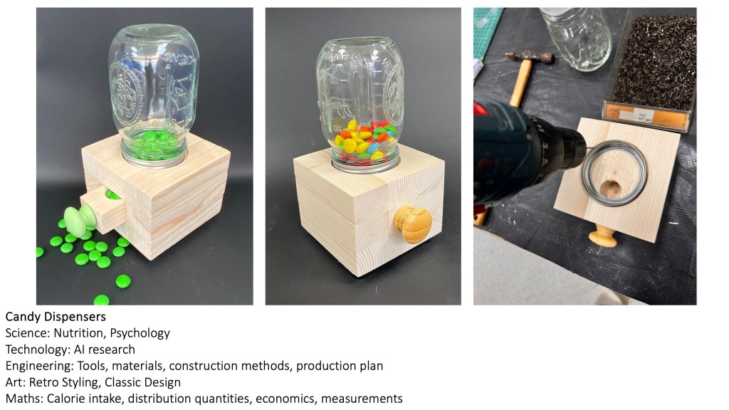 I’ll use the example of a project I did this year, a candy dispenser made with a mason jar. It would have been easy to just make it a simple wood shop project, but integrating questions about nutrition, color, and psychology (why do kids love candy and is it addictive?) didn’t require a lot of extra work and transformed the assignment into a STEAM project. The more you integrate these things, the easier it gets and the better you get at doing it. In the candy dispenser unit, I had an evaluation question at the end asking students to figure out how many times they would need to use their candy dispenser to survive for one day. A bit of an absurd question, but it required math and user testing to figure out! First they had to find out the daily calorie intake for someone their age, test how many pieces of candy came out per use on average from their dispenser, research the calorie amount in each serving based on what the candy was (jelly beans, skittles, m&ms, etc.), then divide that amount by the total calorie intake to get their answer. I would have never thought of that at the beginning of my STEAM journey, but now these questions come a lot more naturally.